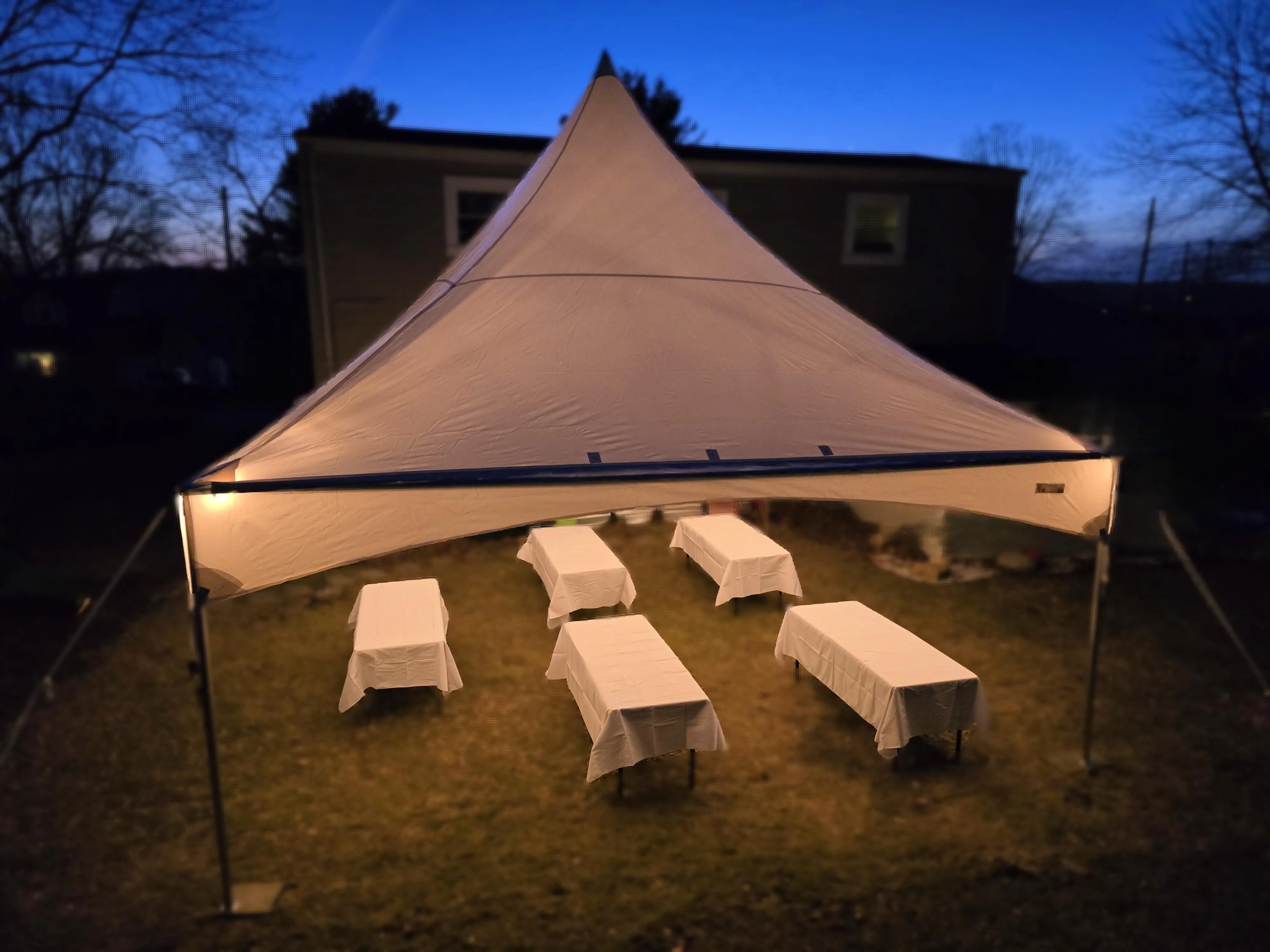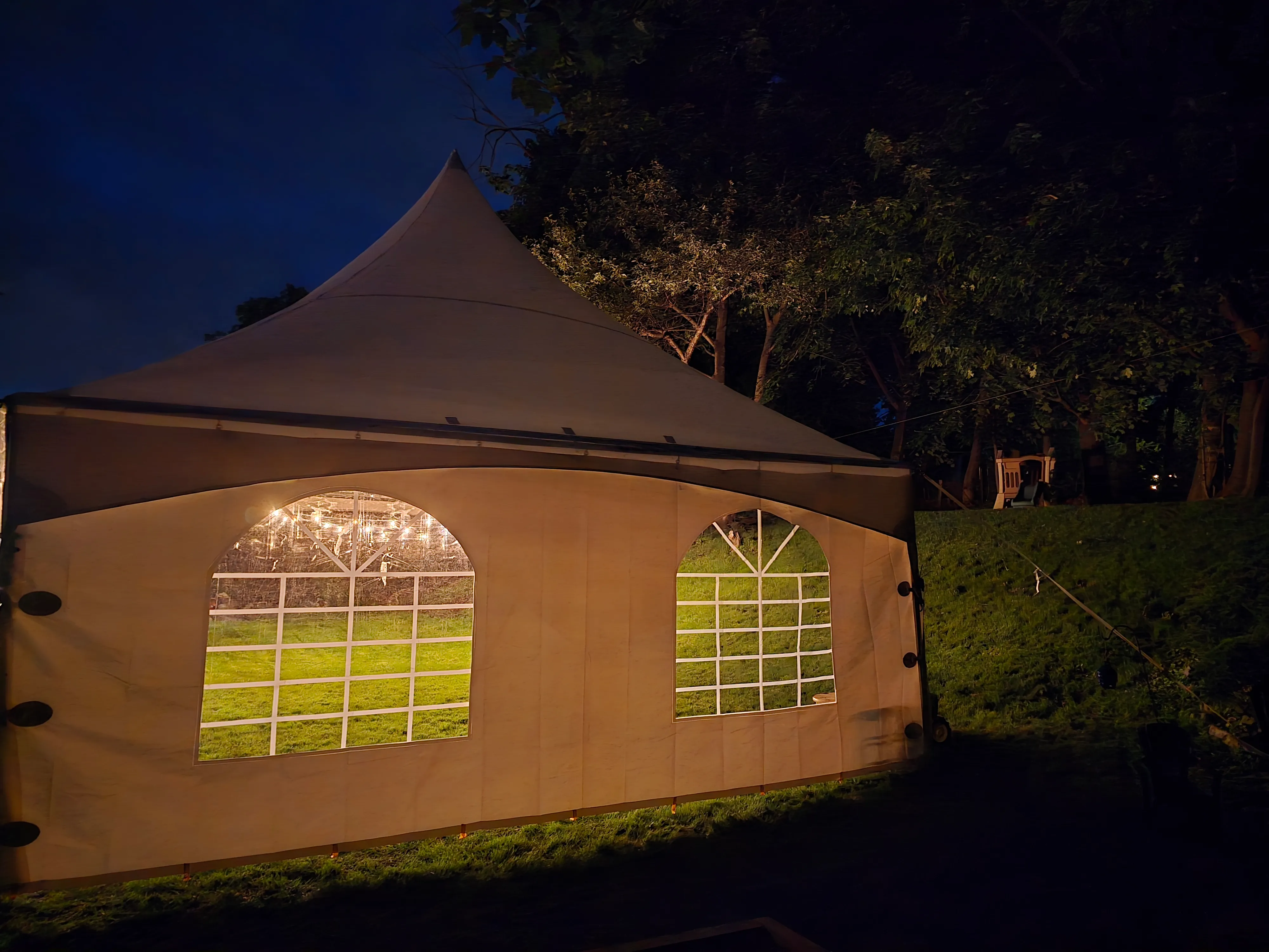 This setup features our 20'x20' High Peak Frame Tent with interior Bistro String Lighting to keep the party going. It provides the perfect warm lit atmosphere for Nighttime fun.