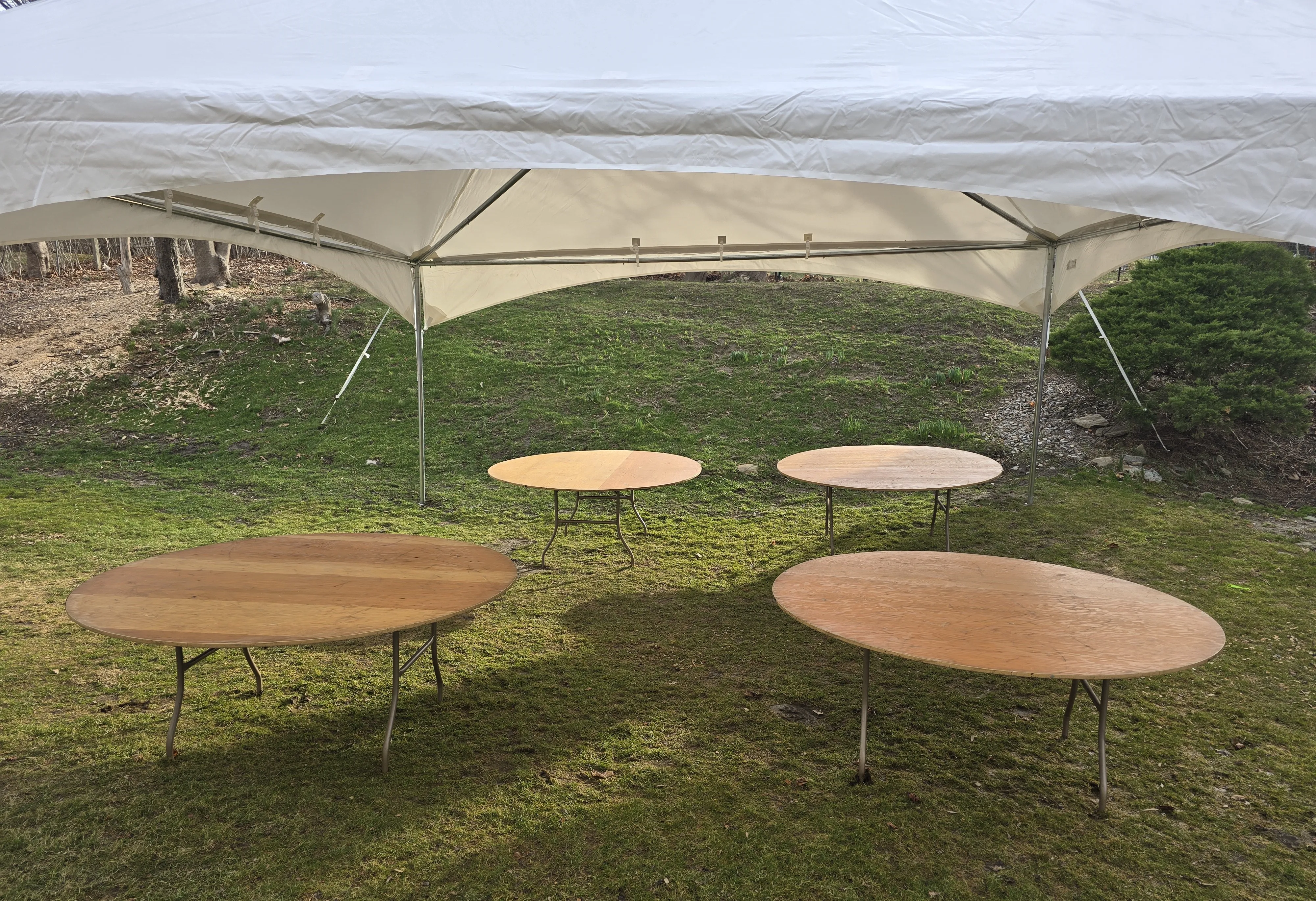 We offer round tables in 72" (Shown Right), 60" and 32" High Top Cocktail Tables.